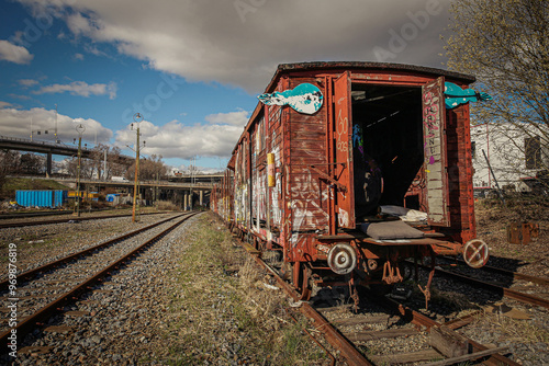 Obraz premium And old railway car sits abandoned in a railyard.
