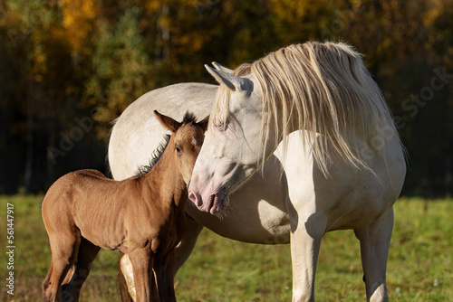 © Rita Kochmarjova, Fototapeta premium Andalusian breed mare with a foal in autumn