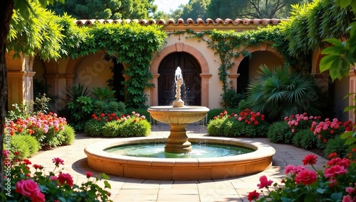 Fototapeta premium Andalusian patio garden, vibrant flowers, Sevilla fountain , fountain, spring
