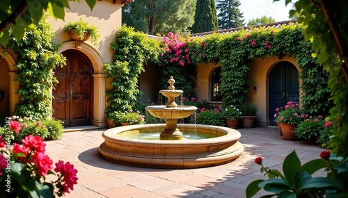 Fototapeta premium Andalusian patio garden, vibrant flowers, Sevilla fountain , plants, Spain
