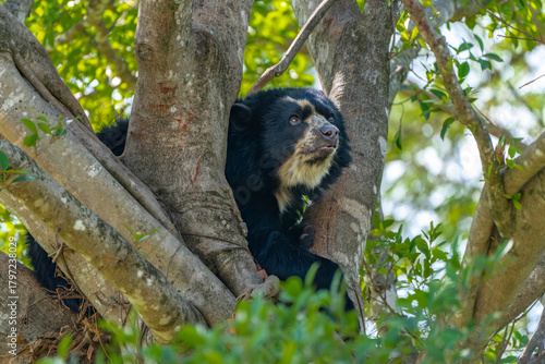 © Adrian de la Paz, Naklejka premium Andean bear cub in tree