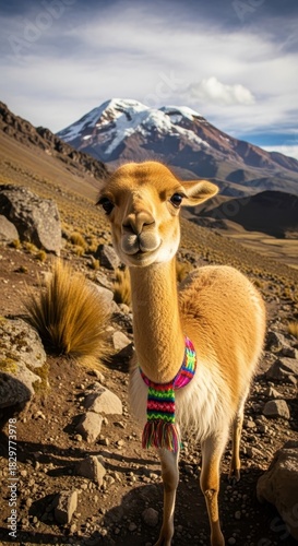 © Asrul, Fototapeta premium Andean heights vicu?a portrait amidst a rugged landscape with snow-capped peak gazing