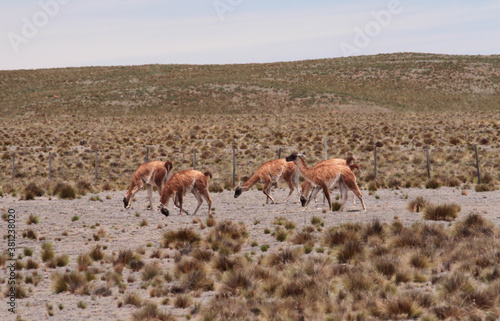© Gonzalo, Naklejka premium Andean wildlife. Herd of Guanacos grazing in the golden grassland in the mountains.