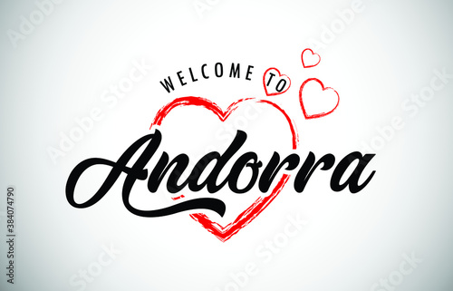 © Metreco, Naklejka premium Andorra Welcome To Message with Handwritten Font in Beautiful Red Hearts Vector Illustration.