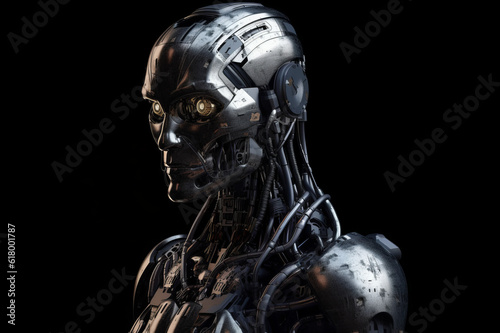 © sderbane, Naklejka premium Android AI robot on dark background. Generated AI tools.