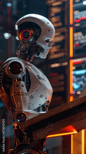 Fototapeta premium Android is using a computer in a futuristic environment with data displayed...