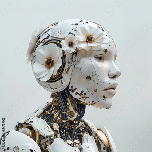 © Andre, Fototapeta premium Androider weiblicher Roboter mit weißen Blüten.