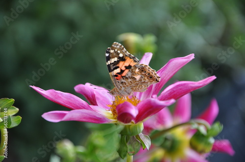 © Marilena, Obraz premium Anemone hupehensis, called «Prinz Heinrich». Flowers of the Japanese anemone, Anemone hupehensis.Vanessa cardui butterfly flower.