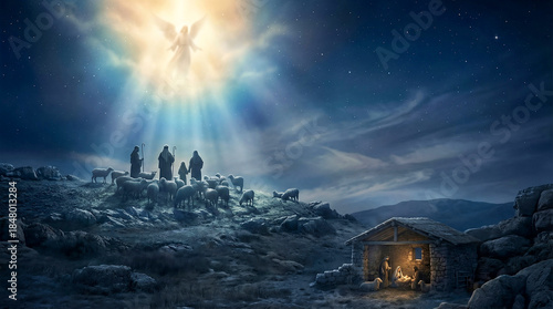 Fototapeta premium Angel appearing to shepherds above the Nativity of Jesus, biblical Christmas...
