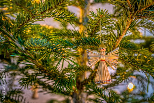 Obraz premium Angel made of straw, hanging in a christmas tree