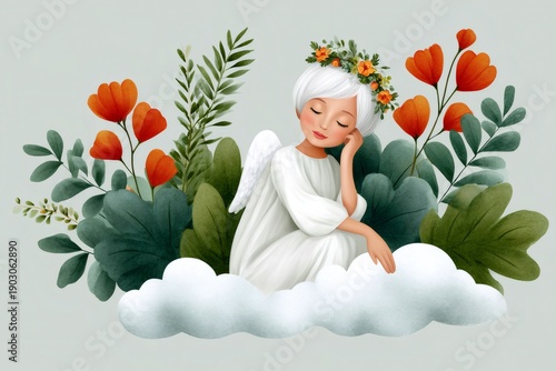 Obraz premium Angel meditating on cloud surrounded by flowers