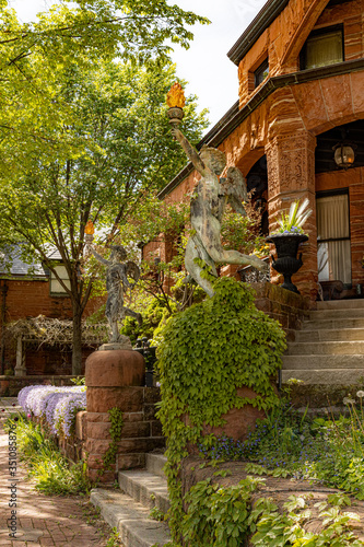 © Bob, Fototapeta premium Angel statue in front of historic red stone house