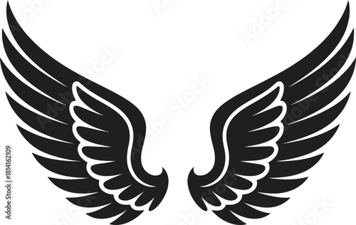 © Creative Juel , Fototapeta premium Angel Wings Silhouette – Black Feathered Wing Shape, Fantasy Winged Symbol, Minimal Vector Illustration