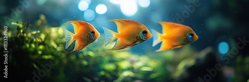 Naklejka premium Angelfish Tropical Aquarium with Green Aquatic Plants and Soft Lighting