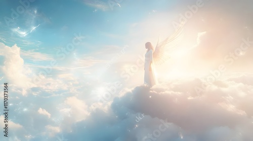 Naklejka premium Angelic Figure Soaring Above Clouds in Heavenly Light