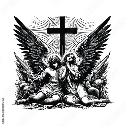 Obraz premium Angelic Intercession, Visualize angels praying for humanity beneath the cross