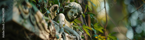 Obraz premium Angels in Historic Cemetery, Overgrown Sections, Close-up View