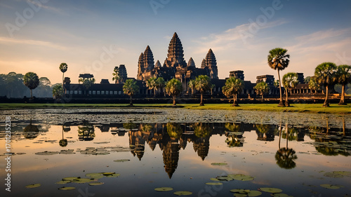 Naklejka premium Angkor wat sunrise reflection cambodia landscape photography serene background tranquil environment