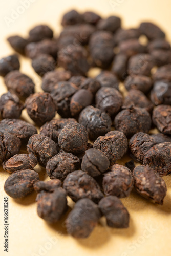 Obraz premium angle view herb Dandouchi or Sojae Semen Praeparatum or Fermented Soybean at vertical composition