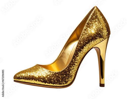 © Sojib, Obraz premium Angled Gold Glitter Stiletto with Reflective Sole, Isolated