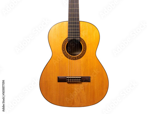 © MDSAKIB, Obraz premium Angled Side View of Acoustic Guitar Resting Upright with Visible Shadow, Transparent Background