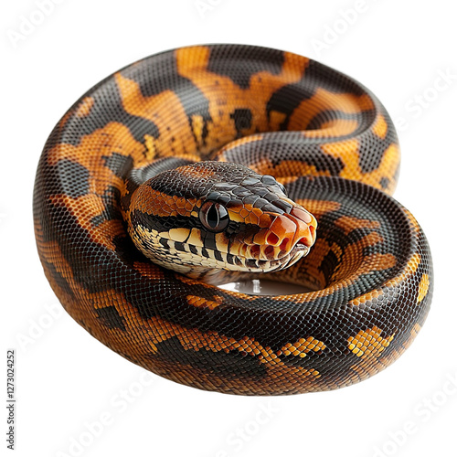 © SunCamCo, Naklejka premium Angled view full body shot of an extremely perfect looking single reticulated python isolated on a white transparent background