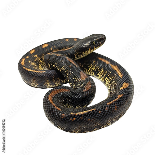 © SunCamCo, Fototapeta premium Angled view full body shot of extremely perfect looking single King Rat Snake animal isolated on a white transparent background