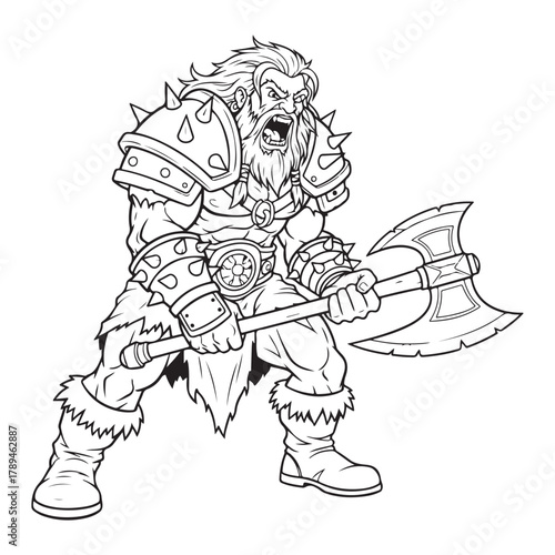 © Alo, Fototapeta premium Angry Barbarian Warrior with Axe, Fierce Male Fighter colouring page