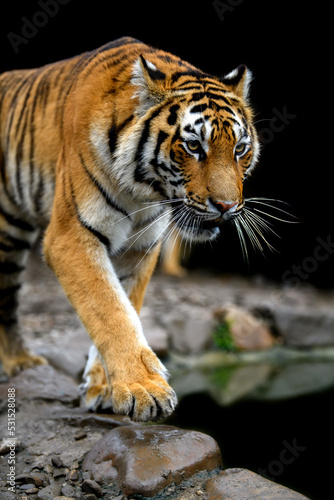 © byrdyak, Naklejka premium Angry big tiger isolated on black background
