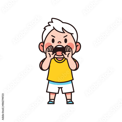 © kiemie, Obraz premium Angry Boy Shouting Loudly, Holding Hands Around Mouth, Isolated on White Background