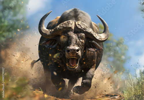 © Hamza, Naklejka premium Angry Charging Water Buffalo Kicking Up Dust in a Forest Environment
