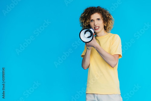Fototapeta premium angry curly teenager screaming in loudspeaker isolated on blue