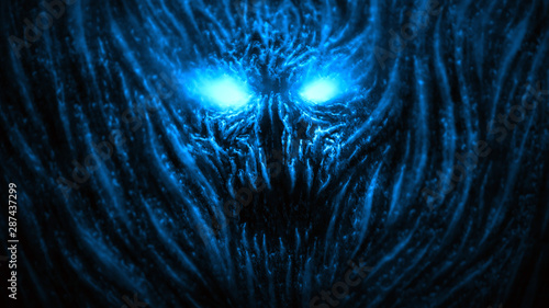 Obraz premium Angry devil face with glowing eyes. Blue background color.