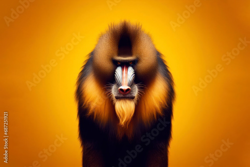 © Igor, Obraz premium Angry disgruntled mandrill monkey on a solid yellow background. ai generative