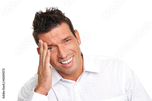 Naklejka premium Angry handsome man in white shirt has a headache