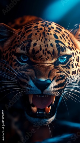 © EwaStudio, Obraz premium Angry Leopard in a Dramatic Blue Glow.
