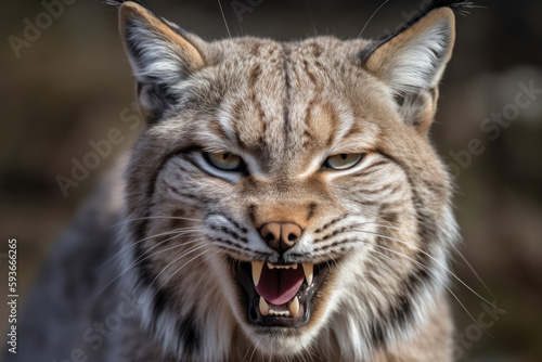 © Giovanna, Fototapeta premium angry lynx with ears back and showing teeth looking at camera.