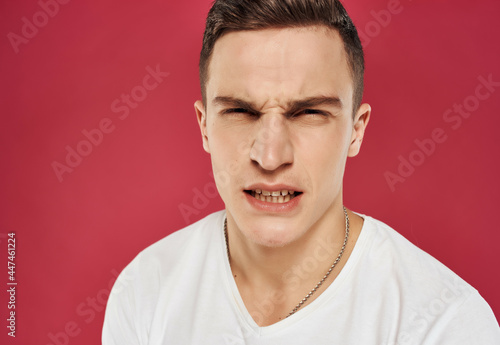 Fototapeta premium Angry man emotions white t-shirt close-up flag red background
