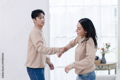 © charnsitr, Fototapeta premium Angry man grabbing his scared partner hand while they have a fight