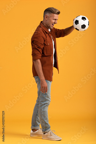 Fototapeta premium angry man holding football standing standing on orange