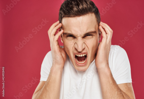 Naklejka premium angry man in t-shirt discontent irritability close-up