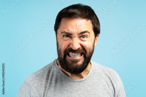 © speed300, Fototapeta premium Angry man showing teeth and grimacing on blue background
