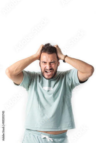 © Vitaliy, Naklejka premium Angry man standing and screaming isolated on white background