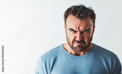 Fototapeta premium Angry man with beard frowning and scowling with copyspace