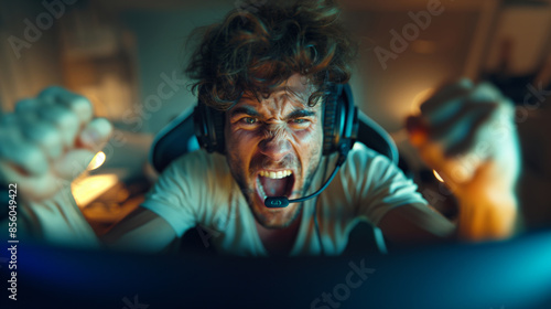 Obraz premium angry man with curly hair playing video games with headset yelling at screen