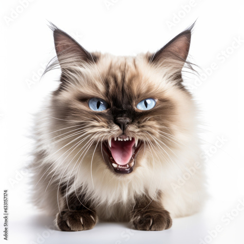 Fototapeta premium Angry Ragdoll Cat Hissing Aggressively on White Background