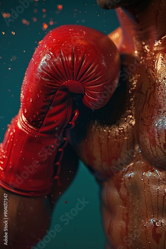 © ArtmediaworX, Naklejka premium Angry strong boxer with very strong musculature. All sweaty with veins poping. His gloves are red and hitting strong. Generative Ai