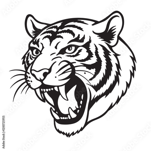 © Smritika, Obraz premium Angry tiger head with roaring mouth hand drawn sketch engraving style vector illustration.