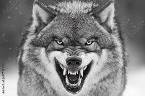 © Maryna, Fototapeta premium Angry Wolf. Greyscale Closeup of Wild Predator with Blurred Background
