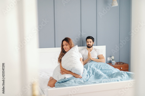 © Dusan Petkovic, Obraz premium Angry woman sitting in the bed and holding pillow with back turned to her husband who begging her for forgiveness. Bedroom interior.
